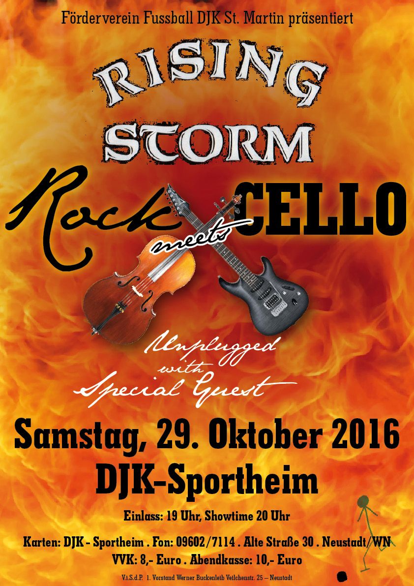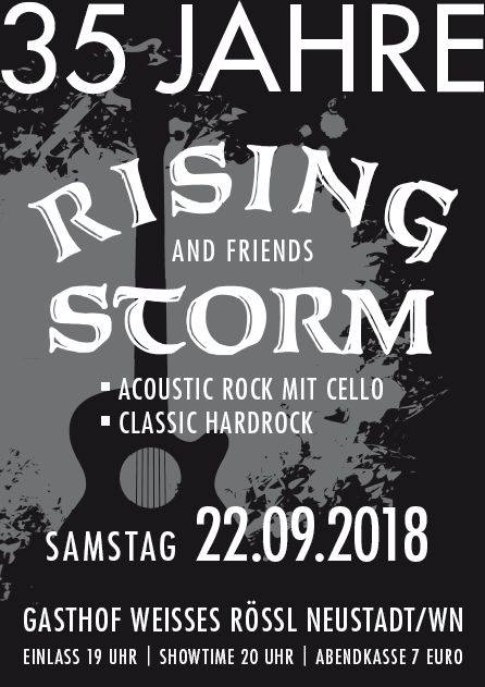 More Than Three Decades In Pictures Rock meets Cello - Stadthalle, Vohenstrauss, 24.10.2021 Lichtblicke Gala - Stadthalle, Neustadt, 05.10.2019 35 Years of Rising Storm - Weisses Röössl, Neustadt, 22.09.2018 Metal Night - Salute Weiden, 04.08.2018, Credits to Geschmacksrichtung Grün Shooting - Hans Prem, 20.07.2018 NEW musics Festival in Tännesberg, 21.10.2017 Frehouse XIV in Neustadt, 07.10.2017 Rock Meets Cello in Neustadt, 29.10.2016 Storm Crusher VI Pre-Day in Weiden, 15.09.2016 Hogler turns 40 beim Brucksaler in Neustadt, 20.08.2016 Trio und Freind beim Brucksaler in Neustadt, 05./06.08.2016 Mädl-Bikerfest in Weiden, 07.05.2016 Firehouse XII in Neustadt, 10.10.2015 Benefiz Open Air in Floss, 12.07.2015 Rathausfest in Altenstadt, 11.07.2015 Kunst & Rotlicht in Neustadt, 03.07.2015 Salute in Weiden, 29.05.2015 Spring Ice Rock in Weiden, 09.05.2015 Unplugged im Cervia in Neustadt, 31.10.2014 Kunst & Rotlicht in Neustadt, 04.07.2014 Open Air in Neustadt, 28.06.2014 Serenade in Neustadt, 05.06.2014 Open in @ D'Wirtschaft, 04.04.2014 Kulturbühne Zentralbüro, 27.12.2013 Salute, 22.11.2013 Firehouse X, 12.10.2013 Bürgerfest Weiden @ Salute, 30.06.2013 Open In @ D'Wirtschaft, 20.04.2013 30 Years of Rising Storm (by Gabi Schönberger), 06.04.2013 Shooting by Gabi Schönberger, 2013 Firehouse VIII, 08.10.2011 Buchberghütte, 24.02.2007 Kirwa Rock, 05.11.2005 Mandl's 30th Wurzstock, 10.06.2005 Mandl's 30th Kirwa Rock 2004 Jugendgremium Open Air 2004 (with special guests) 41 Jahre Mirtl Beutler Bandfest 2004 Rocknacht in Störnstein
